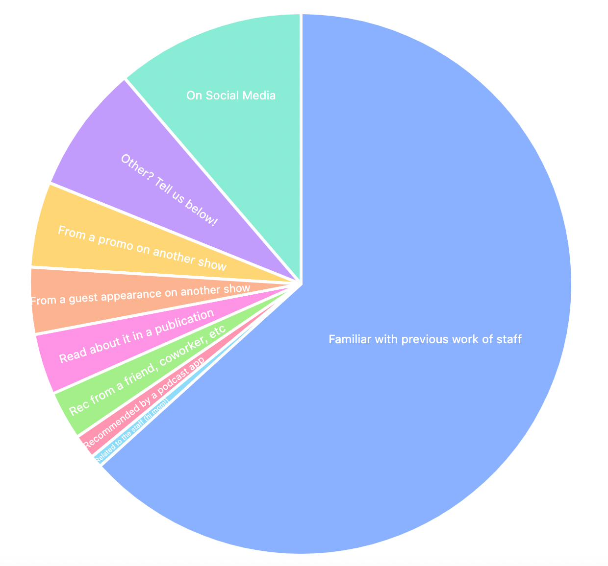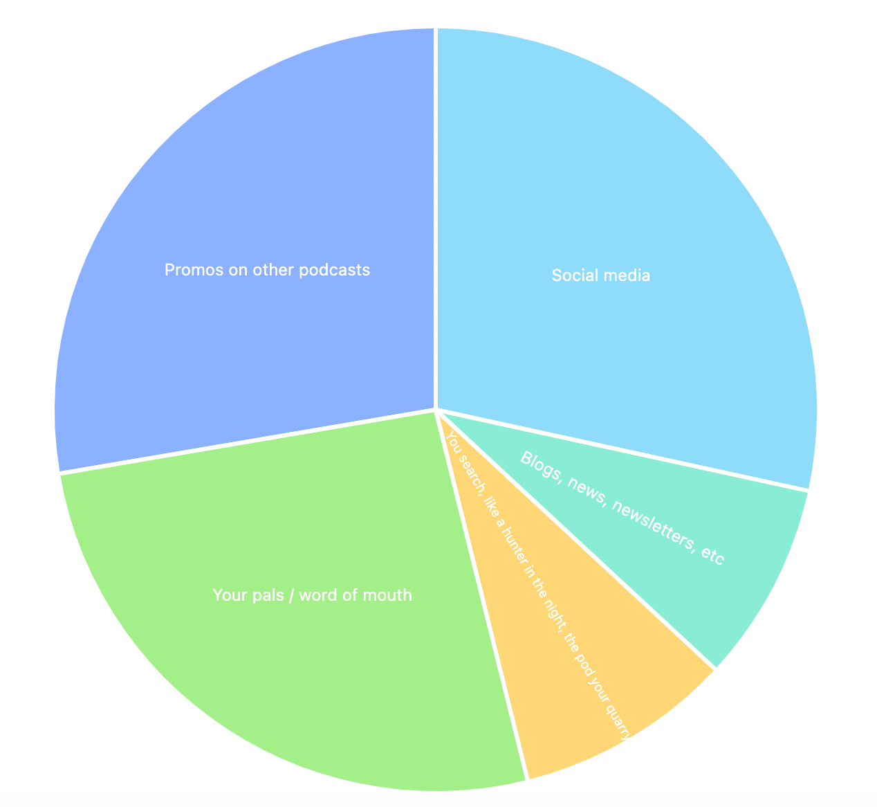 This was honestly the poll I was most interested in seeing, largely because I feel like I find out about podcasts through so many channels — my friends, other podcasts, etc. Would LOVE to talk to you freaky folks who, ahem, "search, like a hunter in the night" for new podcasts, but either way I'm glad you snared us in your comically large net.